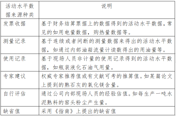 根據(jù)活動水平數(shù)據(jù)的獲得方法,本報告對活動水平數(shù)據(jù)的來源進行了分類,其分類方法和說明如下表所示: