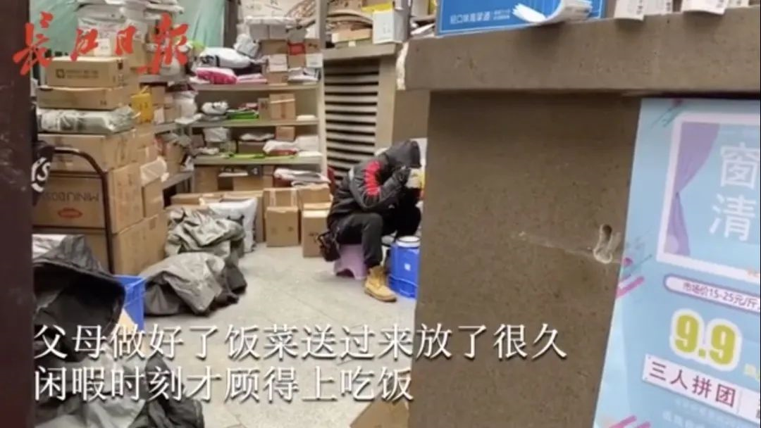 在一次媒體采訪中,一位快遞小哥始終背對鏡頭整理貨品,僅在空檔時間坐在小板凳上吃兩口父母送來的飯菜。“我得在崗,不然武漢人民的口罩怎么取?”