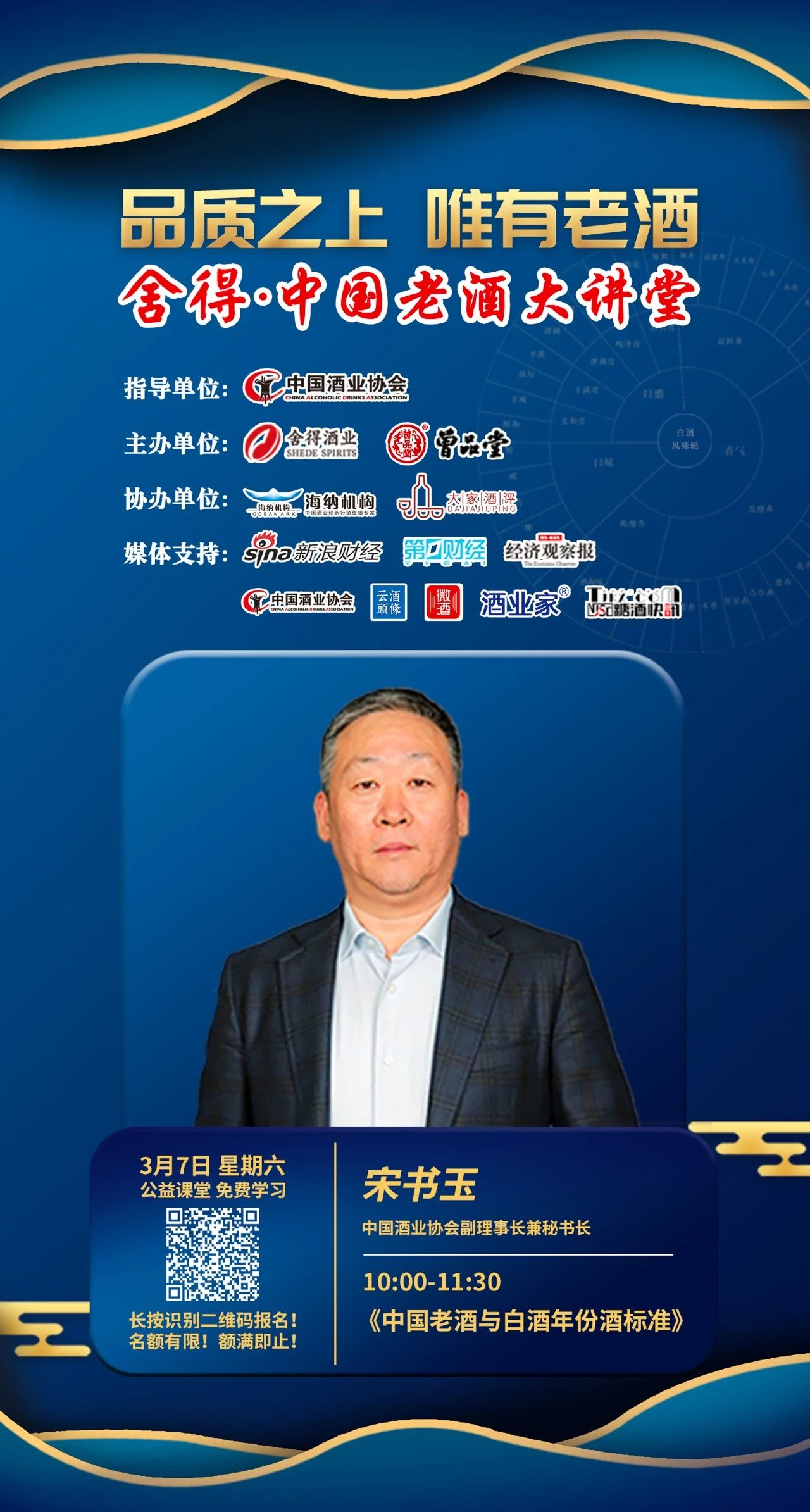 首位主講人是中國(guó)酒業(yè)協(xié)會(huì)副理事長(zhǎng)兼秘書(shū)長(zhǎng)宋書(shū)玉,他將為大家?guī)?lái)《陳年老酒與白酒年份酒標(biāo)準(zhǔn)》的主題課程。