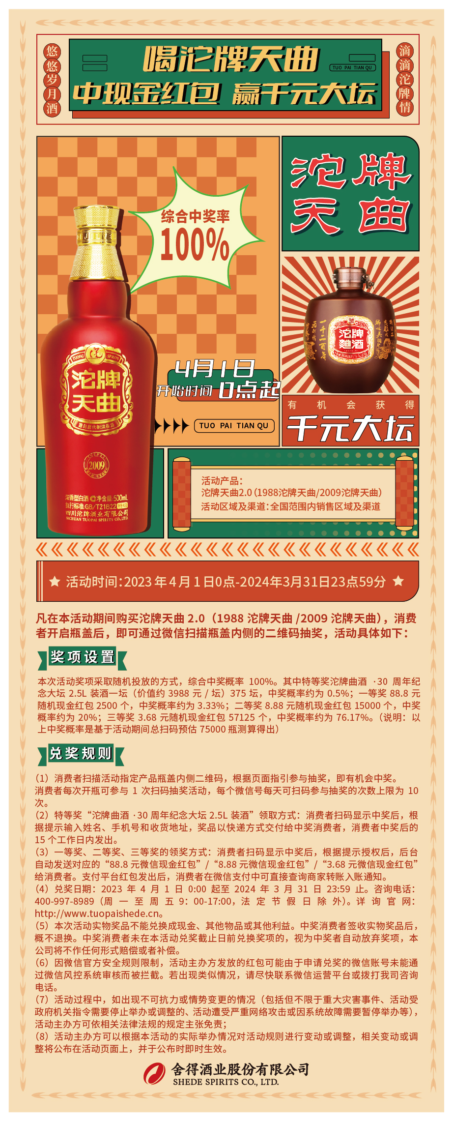 “喝沱牌天曲,中現金紅包,贏千元大壇”消費者促銷活動