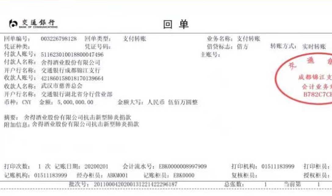 資訊:馳援湖北疫情防控 舍得酒業捐贈1000萬元