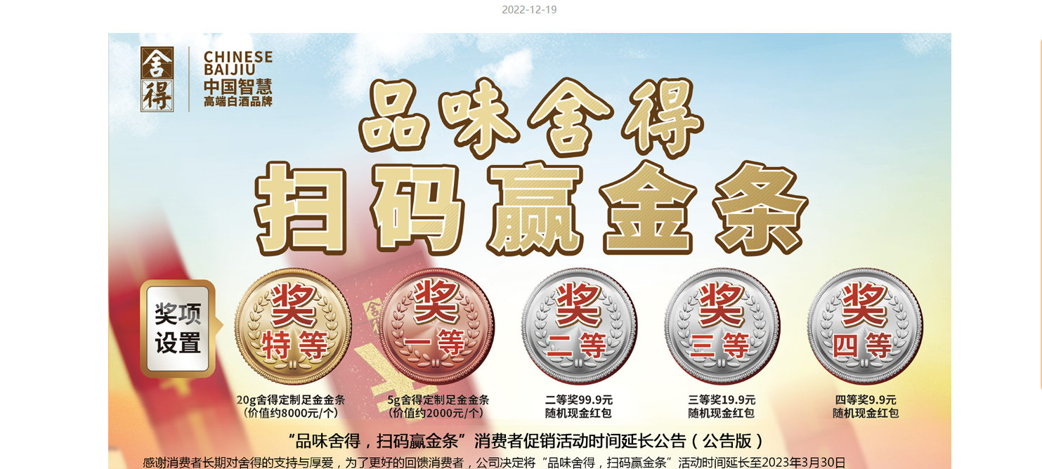 “品味舍得,掃碼贏金條”消費者促銷活動時間延長公告